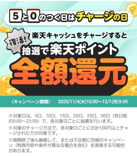 楽天キャッシュを、対象の方法で、「5」と「0」の付く日にチャージすると、抽選で楽天ポイントが全額還元されるチャンペーンが、復活!しましたー!!